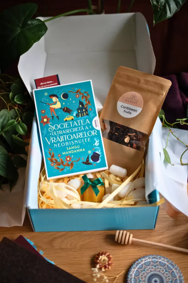 Un cadou plin de farmec și magie: romanul „Societatea ultrasecretă a vrăjitoarelor neobișnuite” de Sangu Mandanna, alături de miere, ceai aromat, semn de carte și cutie premium gata de oferit.